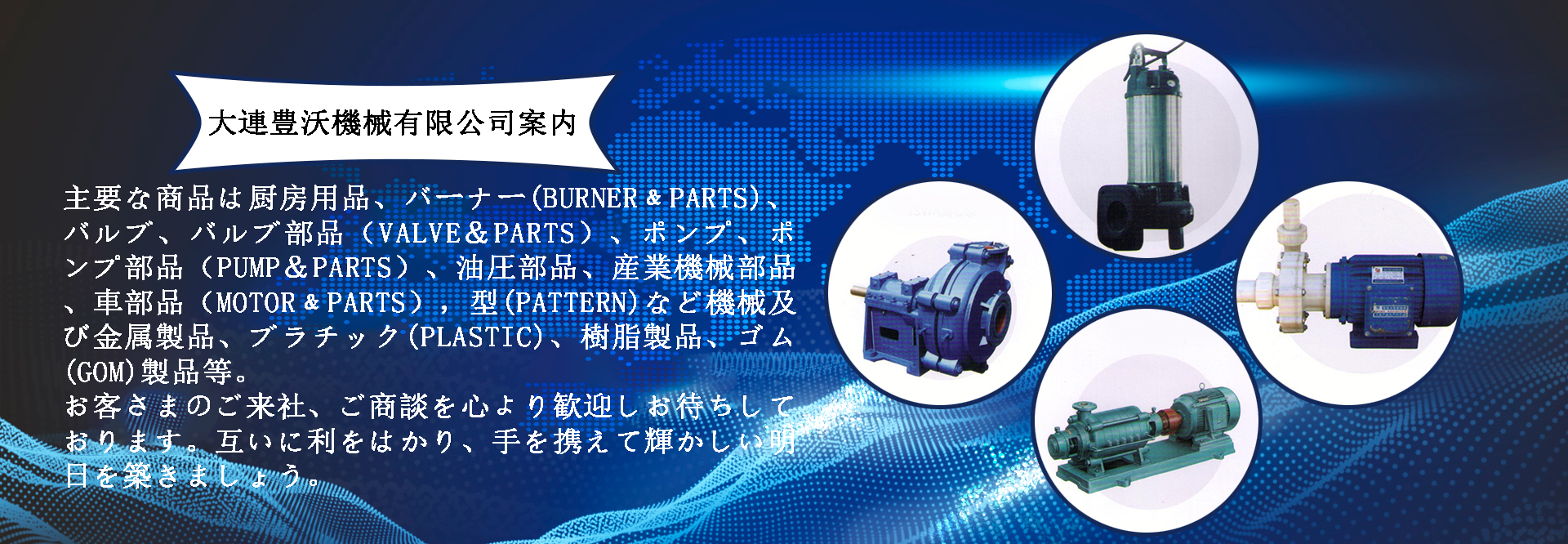 大連豊沃機(jī)械有限公司は國(guó)際貿(mào)易を主にして 専門(mén)商社でおり、子會(huì)社の機(jī)械加工工場(chǎng)を1社持ち、業(yè)務(wù)提攜パトーナが數(shù)社あります。國(guó)際貿(mào)易を従事して十年以上、メインは日本向けですが、アメリカ、ューロパ市場(chǎng)向けも少しあります。砂鋳造(CASTING)(FC,FCD,FACD,ADI)、ロストワックス(LOST-WAX)、鋳鋼(SC,SCS)、ステンレス(SUS)、ダイカスト(DIE-CASTING)(アルミ、真鍮)、鍛造(FORGING)、プレス(PRESS)、製缶(WELDING)など幅多く分野ております。主要な商品は廚房用品、バーナー(BURNER﹠PARTS)、バルブ、バルブ部品(VALVE&PARTS)、ポンプ、ポンプ部品(PUMP&PARTS)、油圧部品、産業(yè)機(jī)械部品、車部品(MOTOR﹠PARTS),型(PATTERN)など機(jī)械及び金屬製品、ブラチック(PLASTIC)、樹(shù)脂製品、ゴム(GOM)製品等。